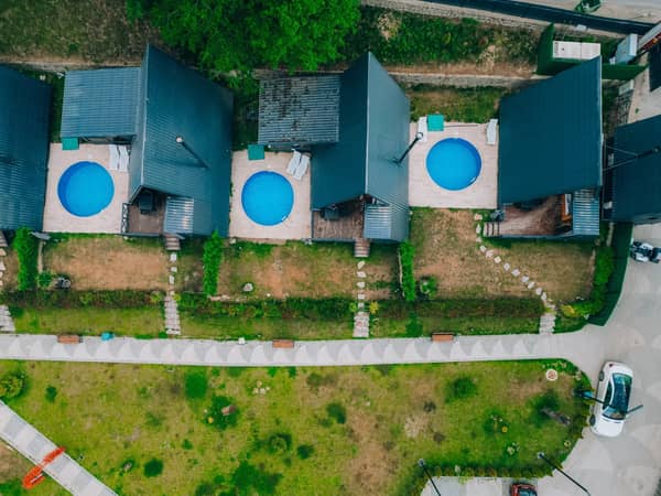 Our facility is situated on a 9,000 m² land area, offering stunning views of nature and the lake. There are a total of 14 bungalows, each equipped with its own private garden and pool spanning 300 m². We also have a shared area of 600 meters, featuring seating groups and a children's park with an 8-meter length.